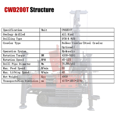 CWD200Tクローラーは、ロータリーウォーターウェルドリルリグに取り付けられており、さまざまな地層の多用途の掘削作業用に設計されています。柔らかい形成には泥掘削と岩の掘削に空気掘削ハンマーを利用し、スラグ放電には空気圧があり、従来のロータリー掘削よりも大幅に高い効率を提供します。